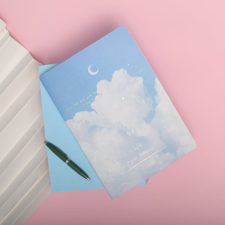 Especially curated for all the dreamers out there, this notebook from Mumuso’s Cute Stationery Collection is made to inspire. Featuring a soothing gradient sky with gentle clouds and a silver moon, it carries a quote that reminds you to dream, create, and write without pause.