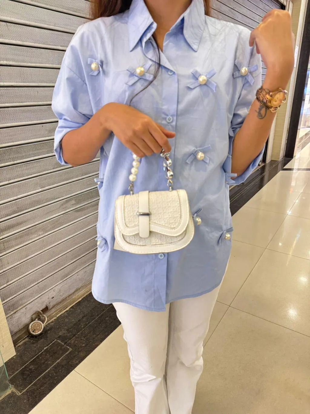 this mini handbag is tooo cute white color with the pearl & chain strap gave with the little hearts my outfit a totally cute nd vibe outfit ke saath bilkul perfect match ho gaya ...!!!!!!🤍👜